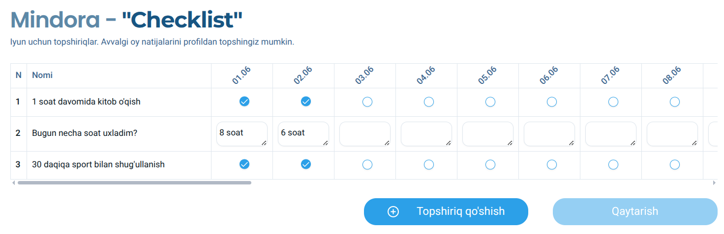 - Kunlik topshiriqlar: Jadvalga asosan har kuni bajaradigan topshiriqlaringizni kiritish tavsiya etiladi va topshiriqlarni bajarib jadvaldan belgilab borasiz.